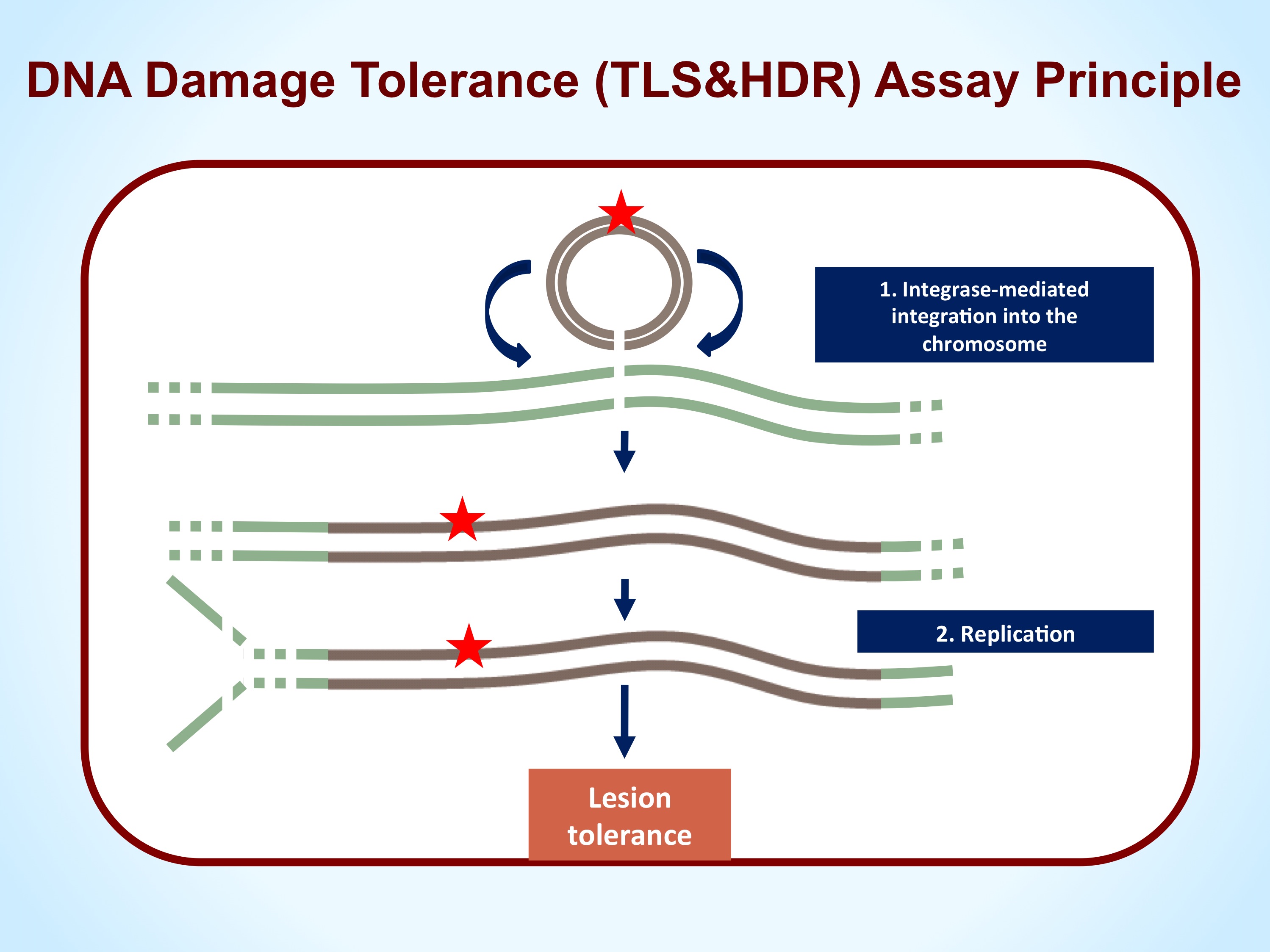 A major obstacle in the study of DNA damage tolerance is the lack of high-resolution methods for simultaneously assaying TLS and HDR during chromosomal replication. Traditional methods are based on monitoring the formation of mutations by DNA damaging agents in a reporter gene (e.g., HPRT), with the assumption that such mutations are caused by mutagenic TLS. However these methods are blind to accurate TLS, which is the main TLS pathway for some common types of DNA damage. Moreover, such methods are ineffective for measuring HDR. We, and others, have used plasmid-based model systems to study DNA damage tolerance via TLS and HDR. These model systems provided a wealth of insight into the mechanism of TLS and HDR, however, they do not obliterate the need to study TLS and HDR at the chromosomal level. To that end we are developing novel methods for the simultaneous analysis of TLS and HDR at a single nucleotide resolution in chromosomes of mammalian cells in culture. This is done using phage integrase, or a transposon, to promote the integration into mammalian chromosomes of plasmids carrying site-specific defined lesions. These systems are useful for the analysis of TLS and HDR in mammalian cells, and their involvement in pathological processes such as carcinogenesis.