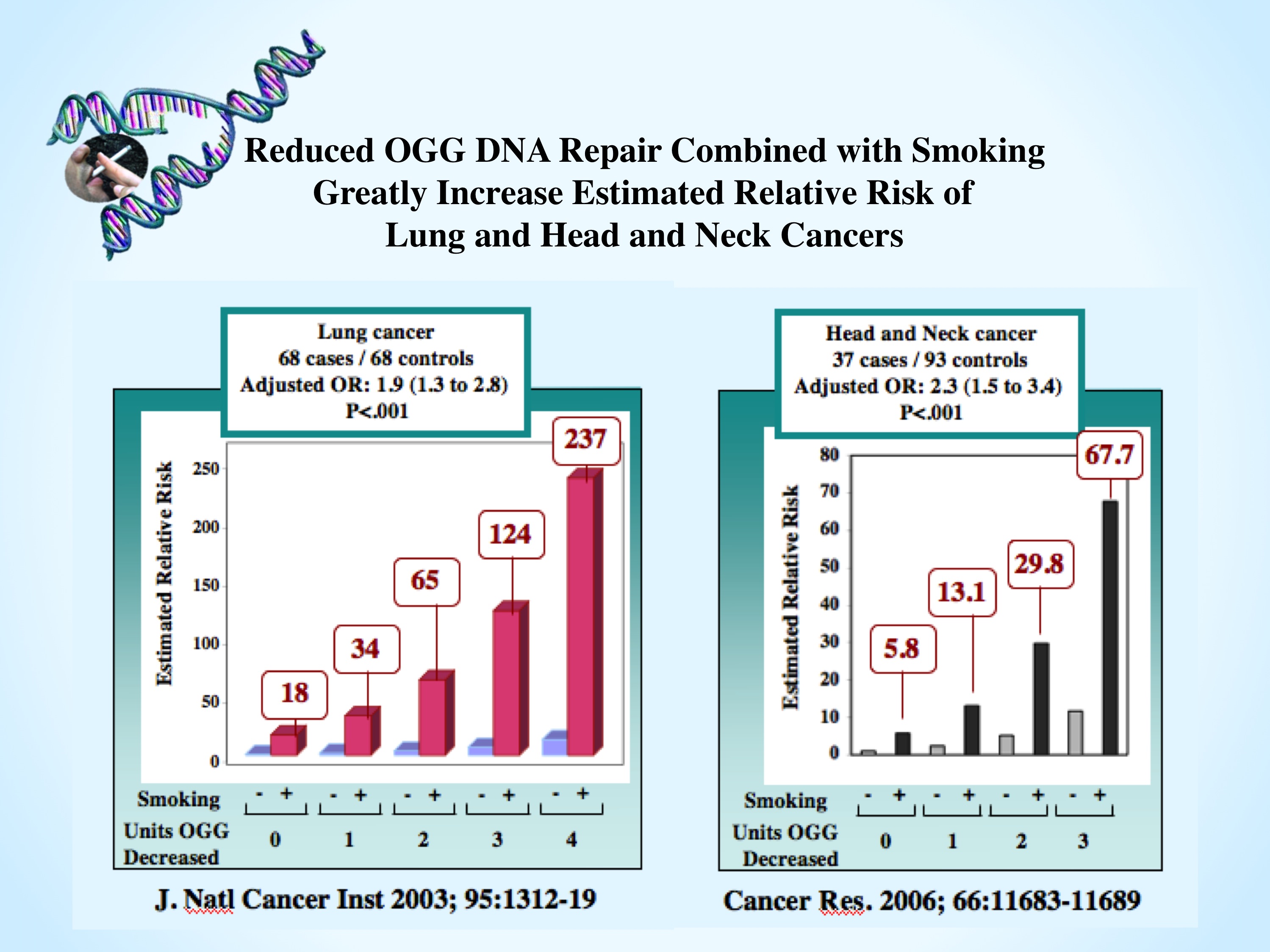 We developed an epidemiology-compatible, robust and reproducible assay for the activity of the DNA repair enzyme 8-oxoguanine DNA glycosylase 1 (OGG1). This enzyme removes from DNA the lesion 7, 8-dihydro 8-oxoguanine (8-oxoG), a highly mutagenic lesion caused by oxidative stress, tobacco smoke, radiation and metabolism. We have conducted a case-control study using this assay, and found that reduced OGG1 activity is associated with increased lung cancer risk. We have shown that OGG activity in the blood correlates with activity in the lung, indicating that it can be used as a surrogate for the lung. Moreover, we have evidence to indicate that the cancer itself does not affect OGG1 activity in the blood. Taken together these indicate that low OGG1 DNA repair activity is a risk factor for lung cancer. Moreover, smokers with low OGG1 had an extra-high estimated risk to develop lung cancer.
