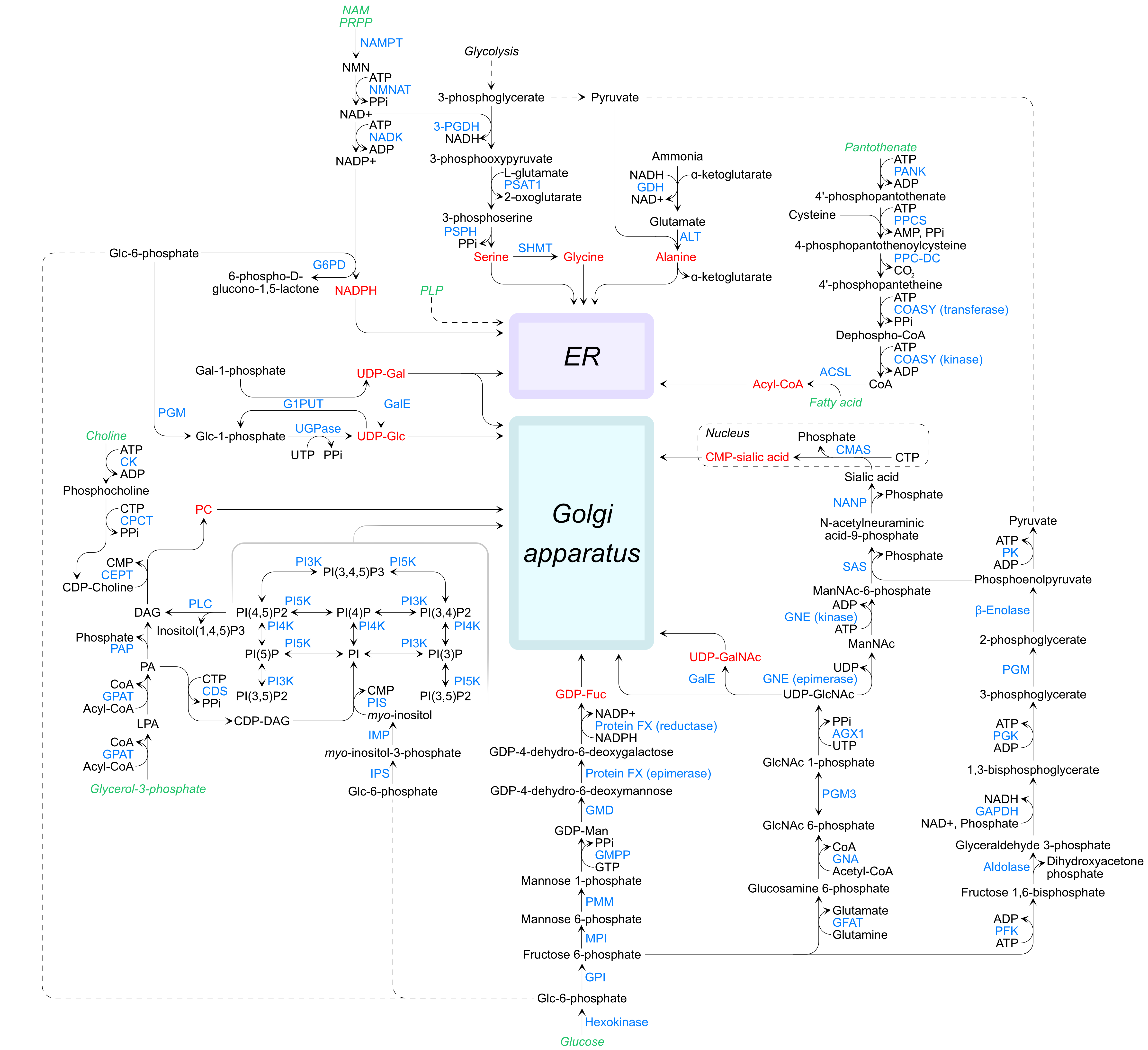 The anteome of the SL biosynthetic pathway in the ER and Golgi apparatus. The pathway for SL biosynthesis in the ER and Golgi apparatus make use of substrates which are themselves generated by a network of metabolic processes, enzymes, substrates, and transporters. Metabolites sourced from dietary intake (i.e., nicotinamide/NAM, pyridoxal phosphate/PLP, pantothenate, fatty acids, choline, and glucose), and vital to nucleotide synthesis (i.e., phosphoribosyl pyrophosphate/PRPP) are indicated in green italics. Metabolites and substrates which are directly involved in GSL biosynthesis in the ER and Golgi apparatus are shown in red. Dashed arrows indicate multiple reaction steps between metabolites, solid arrows indicate single enzymatic reactions. Note that for the purposes of clarity, the phosphatidylinositol phosphate phosphatase enzymes are not shown and likewise the sub compartments of the Golgi apparatus are not indicated.