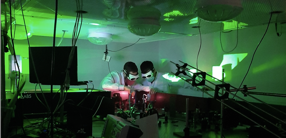 Dr. Omer Kneller (left) and Chen Mor direct a laser beam before it enters the