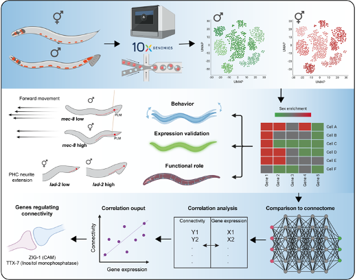 We are working to characterize novel sexually dimorphic behaviors mediated via sex-shared circuits that receive similar environmental input yet respond differently. Specifically, we seek to elucidate how genetic sex modulates neuronal function, neural circuit dynamics, learning and behavior during development. This involves defining the neuronal nodes in which sex-specific modifications occur and that lead to circuit and behavioral changes, as well as analyzing the connectomes of the two sexes at synaptic resolution. At the molecular level, we hypothesize that sex-specific differential gene expression, as determined by the genetic sex, dictates the alternative synaptic choices made by dimorphic neurons and ultimately leads to dimorphic circuits and behaviors. Using single-cell transcriptomics, we wish to determine the depth and breadth of the dimorphic gene expression patterns in shared neurons in C. elegans