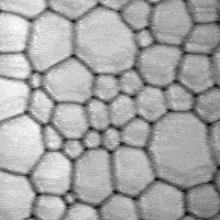 Soap bubbles between two glass panes constitute a good model for these systems. In the case of soap bubbles, diffusion of gas across films is the driving force behind the evolution. Compare the evolution of a soap froth with that of a polycrystalline layer.