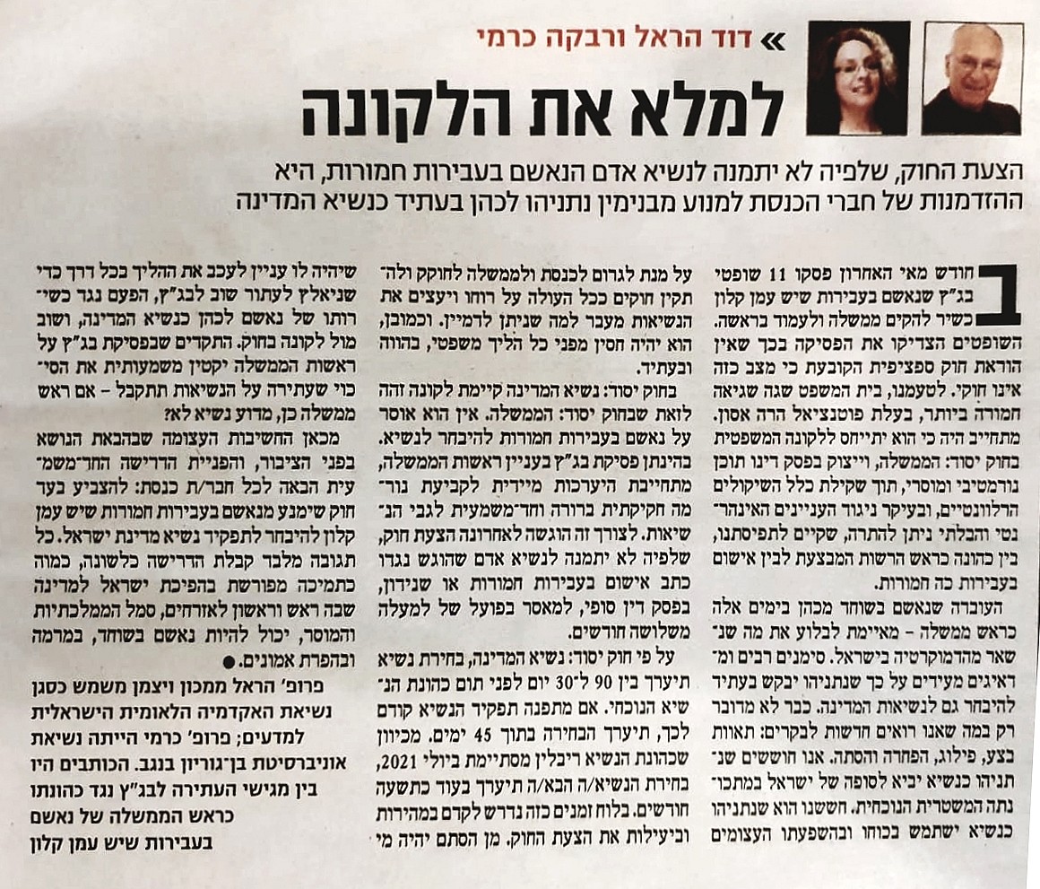 - D. Harel and R. Carmi, "Filling the Judicial Gap?" (in Hebrew), Ma'ariv, August 10, 2020. [JPG]