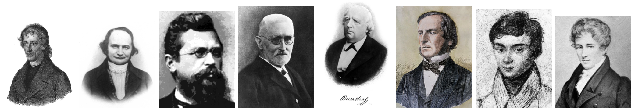 --------אבל-----------------גלואה------------------בול---------------ויירשטראס-----------דדקינד--------------ז׳ורדן------------------ג׳קובי---------------בולצאנו-----