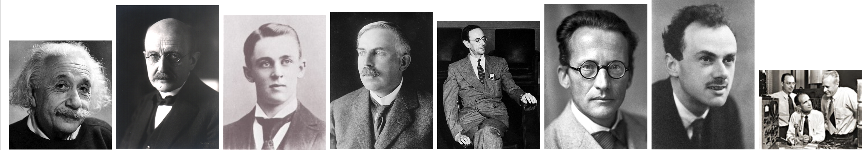 Einstein------------Planck-------------Millikan------------Rutherford---------Chadwick---------Schroedinger--Dirac--Bardeen&Brattain&Shockley