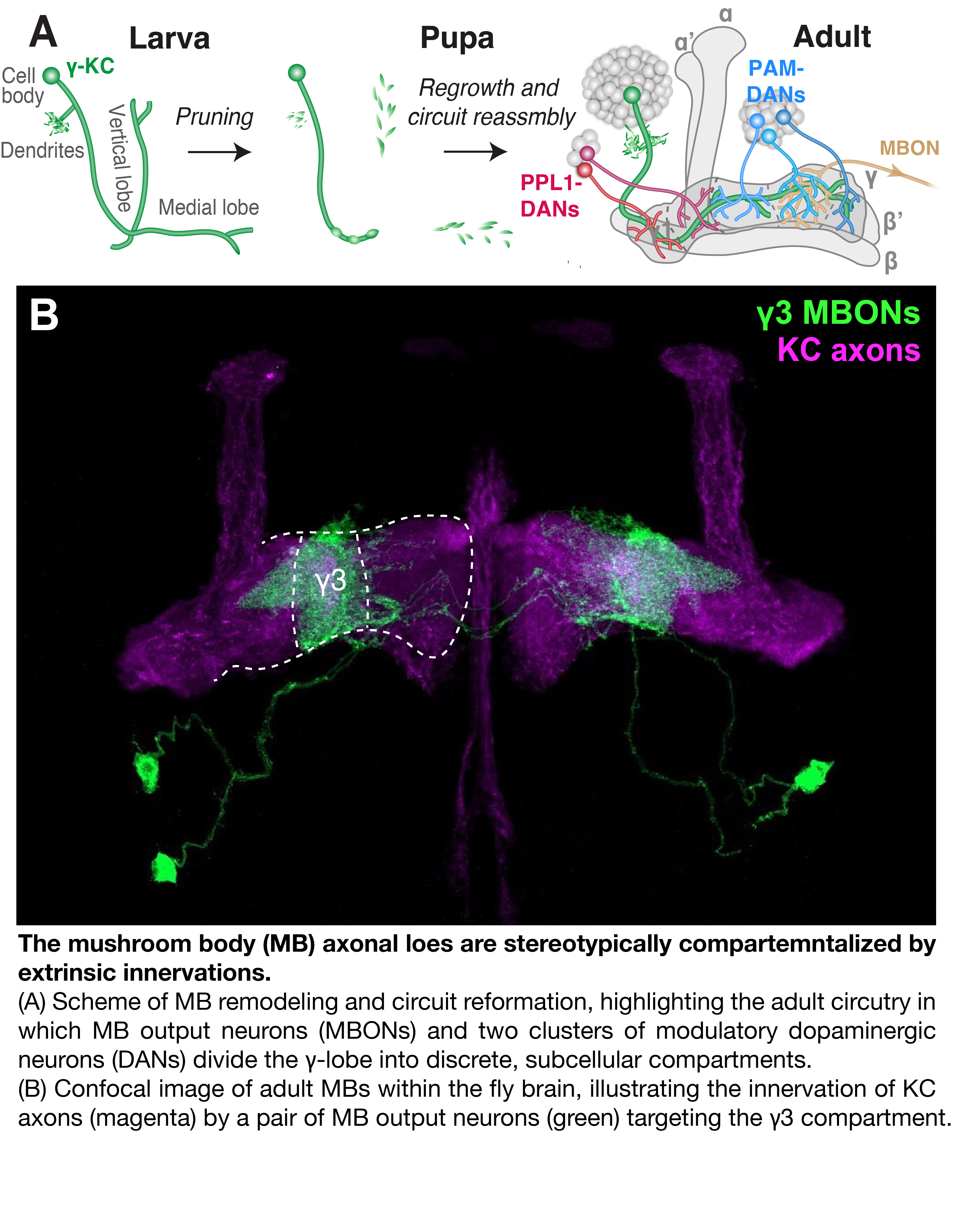 Following pruning, mushroom body (MB) γ-KCs undergo axon regrowth in a genetically-regulated manner, which is distinct from initial axon outgrowth and shares similarities with regeneration following injury. Moreover, the growing axons must synapse with the processes of specific input and output MB neurons, thereby defining discrete sub-cellular zones that mediate distinct aspects of fly behavior.