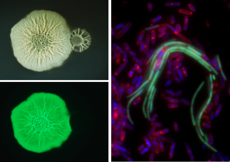 While classically bacteria are thought of as unicellular organisms in nature they exist in complex "multicellular" states - biofilms. We are looking at the different ways bacteria communicate and coordinate cell-fate decisions during their development. This includes cell motility within biofilm and biofilms dispersal. Additionally, we are working on further understanding the role of biomineralization, the formation of 3D mineral scaffolds in the bacterial differentiation.