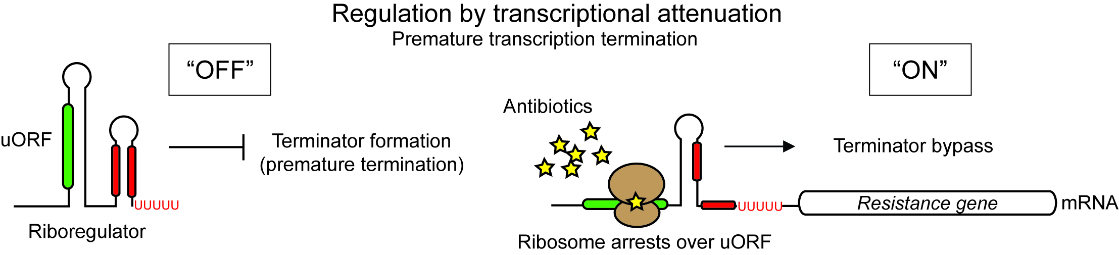 We study 5′UTR-encoded RNA elements that sense intracellular conditions and switch gene expression “on” or “off.” These elements allow an mRNA to autonomously regulate its own expression in response to metabolite levels, either through premature transcription termination or by modulating translation efficiency. Our goal is to discover and characterize novel regulators with potential applications in synthetic biology and therapeutic targeting.